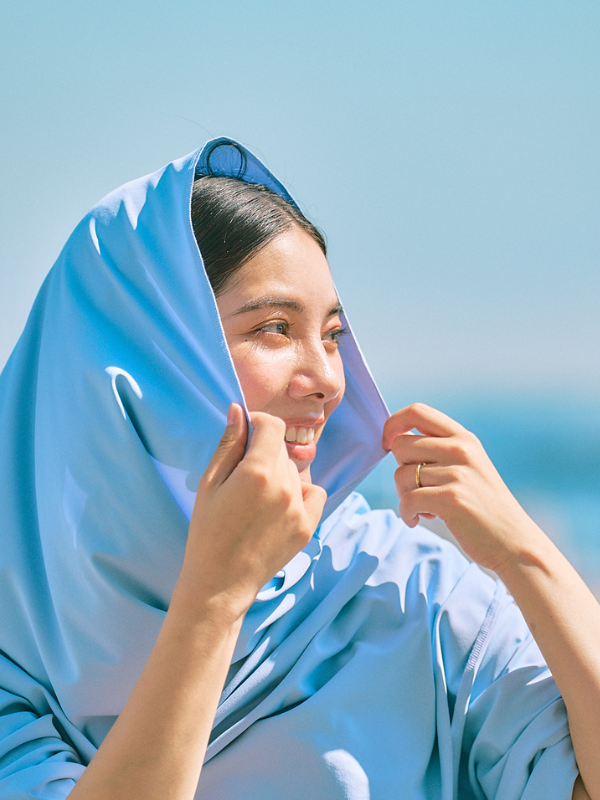 FIT EVERは、頭から肩にかけて好みのスタイルで使えるクーリングラップです。かぶって日差しを避けたり、肩に羽織って風を感じたり、シーンに合わせて形を変えながら、夏の外出をやさしく支えます。